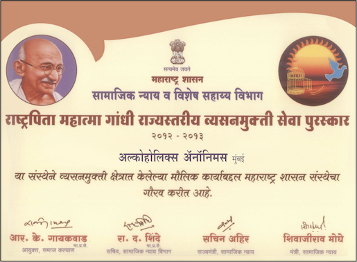 व्यसनमुक्तीच्या कार्यात उत्कृष्ट कार्य केल्याबद्दल महाराष्ट्र शासनाकडून सन्मान